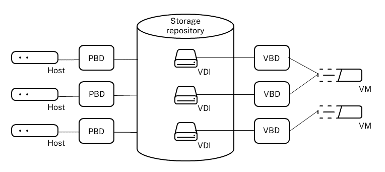 Virtual Block Devices sont des objets de connecteur (similaire au PBD décrit ci-dessus) qui permettent les mappages entre les VDI et les machines virtuelles. En plus de fournir un mécanisme pour attacher un VDI à une machine virtuelle, les VBD permettent d’affiner les paramètres relatifs à la QoS (qualité de service) et aux statistiques d’un VDI donné, et de savoir si ce VDI peut être démarré. Les opérations CLI relatives aux VBD sont décrites dans les commandes VBD.